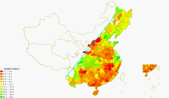 数据来源:图1根据1990年人口普查1%原始抽样数据计算,以40-50岁育龄妇女生育儿子数为统计口径,一般认为,在1990年初生育数量接近更替水平时,农村妇女在40岁以上生育的就凤毛麟角了,可以大致看作是已经结束了生育过程,那些儿子数量为0的家庭可以被认定为是永久的纯女户家庭。另外,由于中国的人口主要分布在“黑河——腾冲”一线以东,限于篇幅,本文主要分析该线以东的情况。