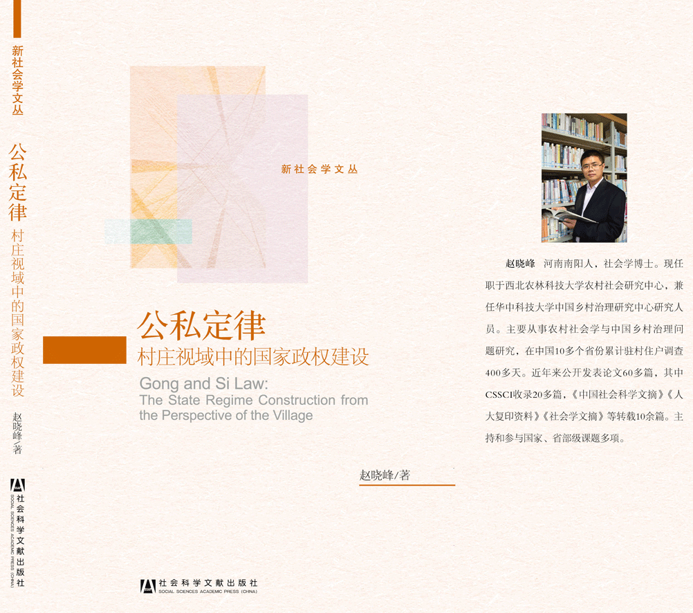 中心毕业博士生赵晓峰著《公私定律:村庄视域中的国家政权建设》(社会科学文献出版社2013年6月版)一书已于近日出版。《公私定律:村庄视域中的国家政权建设》系该社精心打造的“新社会学文丛”之一种。该文丛之前已出版的著作包括国外著名社会学家马克·格兰诺维特《镶嵌:社会网与经济行动》、麦克·布洛维《公共社会学》、吉尔·伊亚尔《无需资本家打造资本主义》和伊万·赛勒昵《新古典社会学的想象力》等等。