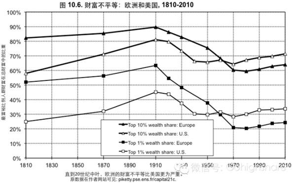 请看书中的图10.6:1810年时,欧洲最富裕的10%人群占社会总财富的80%,最富裕的1%人群则掌控社会总财富的50%,这一状况大致持续到1914年第一次世界大战。而在1910年到1970年间这一比率则大幅下降,但1970年后至今这一比率又开始回升。皮克提此书最令人震惊的预言是,如果没有激进的平等化改革措施,到21世纪末将重现整个19世纪收入和财富分配高度不平等的图景。从图中可以看出美国不平等的轨迹和趋势与欧洲大致相同:1810年美国最富裕10%人口掌握社会总财富的比重接近60%,最富裕1%人口则拥有总财富的25%左右。这是因为作为新大陆,美国资本积累和社会分化需要一段时间才能展现出来。从1910年到1970年,美国的不平等也呈现下降趋势,而不平等从1970年代开始又开始加剧。