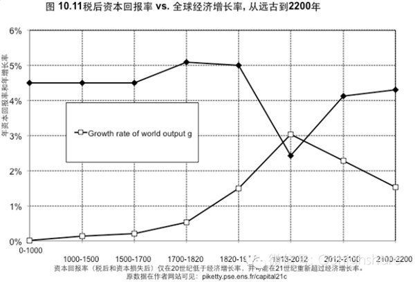 从图中可见,在18世纪中叶以前,世界经济年增长率只有0.5%到1%,而资本(当时主要是土地)年回报率则有4%到5%。只有20世纪的两次世界大战及其带来的制约资本的社会政治变革,才使得g曾一度大于r,但1970年代后r>g又得到恢复。皮克提认为,r越是大于g,过去的资本财富积累就越是在现今社会发挥更大支配作用。这个观点背后的直觉是他给出的一个例子:如果g=1%,r=5%,那么资本所有者只需储蓄其资本收入的5分之1,就可以保证其资本存量增长与国民经济增长同步。皮克提推算21世纪的资本回报率在4%左右,由于人口增长和技术进步在发达国家放缓(而中国和印度在赶上发达国家后将呈现同一趋势),21世纪后半叶全球经济年增长率将下降到1.5%,r>g的程度大致恢复到19世纪,坐享继承的财富将比努力工作对年轻人更具吸引力(如巴尔扎克的小说“高老头”所生动描绘的),这就是他所谓的“拼爹资本主义”( patrimonial capitalism)的重现。