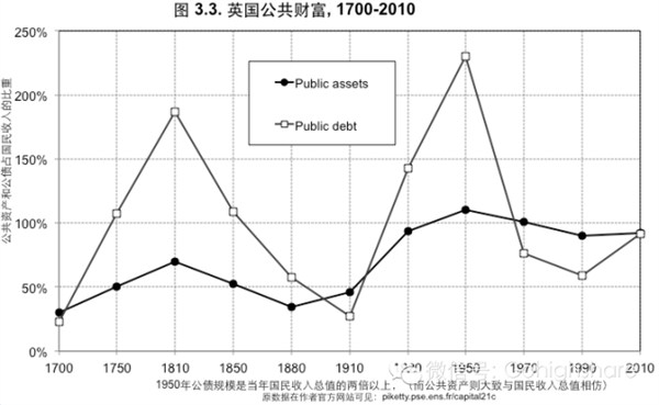 近年来,对我国地方政府负债水平的批评也往往根据欧盟的“黄金准则”,即看地方债务与地方GDP之比,而不考虑地方公有资产,因此皮克提对欧盟黄金准则的批评对我国也极有启示意义。下图是皮克提给出的英国国有资产与国债的历史演化。