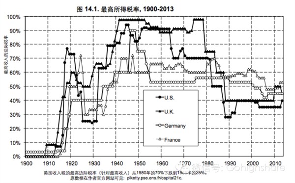 皮克提强调“累进所得税的产生是因为世界大战,而不是普选权的自然结果”(皮克提书英文版514页)。法国议会通过建立所得税的法案是在1914年7月15日,是作为即将到来的第一次世界大战的财政应对措施;美国在1913年通过宪法第十六修正案建立了所得税制度;英国和瑞典则是在更早前的1909年和1903年建立的此项制度。如皮克提下图所示,尽管这些国家的所得税制度都略早于第一次世界大战,但最高税率却是在一战之中和之后才大幅提高的。例如法国1914年的最高税率仅为2%,但1920年该税率提高到50%,1924年该税率提高到60%,到1925年,则提高到62%。又如英国,1909年的最高税率为8%,而一战后英国将此税率提高到40%,而美国则在1919年将最高税率提高到77%。德国的情况则更有趣,普鲁士早在1891年就建立了所得税制度,但从1891到1914年最高税率一直是3%。1915至1918年,该税率提升到4%,但德国战败的1919年,最高税率立刻提高到40%。