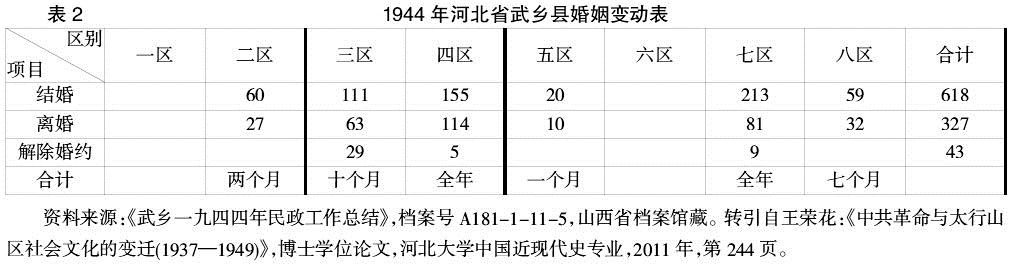 在婚姻条例颁布数月内,晋冀豫区一些地方离婚案件每月达40多起(见表1)。根据不完全统计,1941年6月至1942年5月,晋冀豫区经妇救会解决的离婚案多达1694起;⑦太行区1941年一年当中发生离婚案共971件,并且许多地方因受压制未提出。⑧1944年,武乡县记录在案的离婚案件有327起,但并非全县统计。按平均值估算,武乡县8个区离婚案件至少有436起(见表2)。1945年,冀鲁豫边区高等法院的报告显示:“一月以来各县司法部门受理的民事案件中,离婚案件是最多而较难处理的问题。仅以一专来说,全专区共处理民事案件81件,离婚案件□为41件,占总案数的50%强。依据全太行区四十个县报告的统计,上半年共处理民事案件1629件,离婚案件共536件,占总数的30%强。……平顺今年上半年五个区所处理的离婚问题达二百零五件。如果我们连区一级所解决的数字也统计起来,更是相当大的一个数目。”⑨1948年1-9月,易县、完县、满城、涞源等5县共受理民事案件192起,其中婚姻问题达140起,涞源是100%,满城是84%。⑩冀南区党委妇委会在1948年印制的《妇女工作参考材料》中提到:“无论在土改前或土改后,各地区法院所受理的婚姻案件占民事案件的50%至90%,其中绝大部份(分)系离婚解约问题。”(11)从1948下半年至1949年1月半年时间里,太行六专署全区共受理民事案件456起,婚姻案件366起,占全部民事案件的80%。(12)