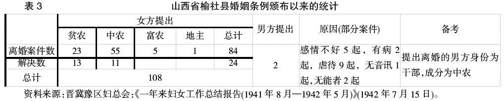 这一时期,各地“妻休夫”的理由很多,如感情不合、婆媳不合、受虐待、有外遇、生活困难、年纪差距大、丈夫参军且长时间无法联系和政治原因等。据平西县1941年的总结,“妻休夫”者占妇女总数的45%,因感情不合要求离婚者占60%。在太谷,80%离婚案件的主因是感情不合。(43)多数乡村男女婚前没有交流感情的机会,“婚姻成立时,在夫妇双方感情基础方面通常还是一张白纸”。(44)国人的习俗是“把婚姻关系看作是依赖于配偶之间重大的责任与义务而非依赖于个人的爱情与情感”。(45)因此,经济更多地替代“感情”成为婚姻的基础,是维系婚姻的重要纽带,所谓“有米有面成夫妻,没米没面收拾起”。(46)提出离婚的农妇,多是“嫌夫家生活不好,藉以婚姻不自主感情不好而离婚”。(47)1942年晋冀豫区工作总结指出:嫌贫爱富是“妻休夫”的主因。(48)不少“女方看到男方的生活艰难,就灰心失望,以至影响到双方的感情,发生离婚纠纷”。(49)“妻休夫”以“感情不合”为由,显然是要利用各地婚姻政策达到离婚目的的借口,与强调以感情为婚姻基础的话语大相径庭,也严重扭曲了中共婚姻观念的根基。