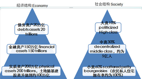 经济结构上我们是个金字塔,底座是庞大的物质财产。为什么?因为过去我们庞大的物质财产没有被货币化,在1992年之前中国所有的物资供应靠国家计划分配,老百姓的消费靠票证来决定,从1992年我们放弃了所有的票证,中国进入了货币化元年,于是货币大幅度增发,同期中国开始放开了三大最能吸纳货币的市场——房地产、期货和证券,带动了中国经济的高增长,这个过程实际上把过去没有货币化的实物资产变成了货币化的可交换的金融资产,于是在庞大的实物资产这个底座上成长出来了一块金融资产。我们的实物资产有多少呢?现在大约有200万亿;我们的金融资产有多少呢?大约有150万亿;再上边就是所谓债务资产20万亿,债务相对占的比重还是最少的,所以我们才说它是一个正的金字塔结构,底座是庞大的物质资产。