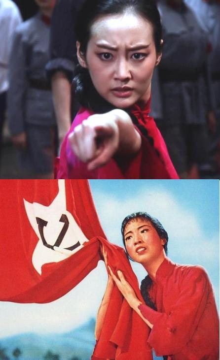 二、上面两位为电影《归来》中的红色娘子军形象:红嘴唇,噘嘴巴,面无表情,丑极。下图为七十年代样板戏中的红色娘子军形象,则充满了革命朝气。