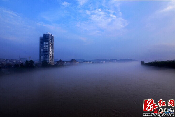 7月17日傍晚,洪水退后的锦江河面云雾升腾,城市建筑有如坐落在仙境一般,过往群众纷纷为这难得一遇的奇观而惊叹。