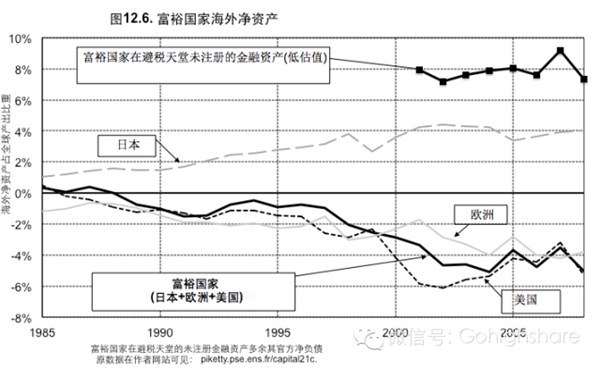 实际上,阅读皮克提书中的图表可以是一种享受。如下图12.6说明发达国家在避税天堂(如瑞士和一些群岛)的未注册资产高于这些国家的官方净负债。这说明发达国家仍然是债权国。这就解释国际货币基金组织的国际收支统计中的所谓“火星人拥有地球”之谜,即:富国和穷国都是净债务国(皮克提英文版第465页)。