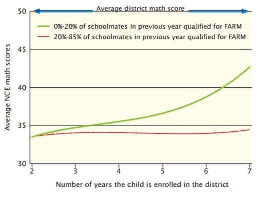 20年前,标志性书籍《真正的穷人》(The Truly Disadvantaged)中强有力的论述,以及关于社群隔离的负面效应的权威研究,使得联邦贫困问题专家深受启发,于是他们启动了一项政府实验项目,让855户低收入家庭从贫困城区的公租屋中搬到经济状况更好的社区。这些家庭绝大多数为非洲裔和西语裔。 项目的结果引发了激烈争论。 该计划名为“搬向机遇”(Moving to Opportunity,简称MTO),始于比尔·克林顿(Bill Clinton)的第一个总统任期。当时,联邦住房与城市发展部从巴尔的摩、波士顿、芝加哥、洛杉矶和纽约随机选择了一大批有小孩的低收入家庭。其中98%的家庭由女性支撑;63%为黑人、32%为西语裔、3%为白人;26%有工作、76%领救济,以2009年价格折算的家庭平均收入为1万2709美元(当时约合8.7万元人民币)。 参与项目的共有4604户家庭,分为三组。一个实验组有1819户,政府向他们提供了“《住房法案》第8节规定的租赁补助券或代金券,但只能在1990年贫困率低于10%的人口普查区内使用”;855户接受了提议,参与到这项研究中。第二组有1346户,政府向他们提供的是更为传统的租赁劵,可以用在任何社区;848户对此予以接受。 此外还有1439户家庭留在公租屋社区里,成为研究中的对照组。联邦住房与城市发展部表示,这一搬迁项目的目的在于,测试“受助家庭进入低贫困社区后在住房、就业和教育成就方面的长期效应。”研究人员还研究了搬迁对领取租赁劵人员的健康影响。 《美国经济评论》(American Economic Review)2013年5月刊发表了一篇题为《低收入家庭的长期社区效应:以“搬向机遇”项目为例》(Long-Term Neighborhood Effects on Low-Income Families: Evidence From Moving to Opportunity)的论文。文中发现,相关家庭通过MTO项目迁出高贫困公租屋社区的10到15年后,结果好坏参半。 论文的第一作者芝加哥大学(University of Chicago)经济学教授延斯·路德维格(Jens Ludwig)是负责MTO最终评审的项目主管。他表示,的确存在一些积极进展。他和六名论文合著者发现,受试者在“几项关键的成人心理与生理健康指标”上有所进步,比如糖尿病与肥胖症的风险显著降低,以及“幸福感”有所提升。 不过,路德维格的研究还发现,“光是变动居住社区,或许并不足以改善底层家庭的就业或学业成就。”他在文中指出,这种允许家庭搬迁到“低贫困”地区的特殊租赁券“在一些方面没有可观察到的持续效应,不管是经济上的自给自足,还是孩子的教育成就,就连实验伊始年龄尚小、没有入学的孩子也如此。” 在民主党“三维智库”(Third Way)本周发表的一篇后续文章中,路德维格提出了类似结论。 美国的一些最为权威的贫困问题研究者,比如哈佛社会学教授、《真正的穷人》的作者威廉·朱利叶斯·威尔逊(William Julius Wilson)认为,MTO项目存在设计缺陷,从而引来了就业与学业方面未能有所改善的不妥结论。 在写给《纽约时报》的电子邮件中,威尔逊指出,MTO项目里离开公租屋的家庭还是搬到了隔离社区,远离就业机会,而学校的糟糕程度也不相上下,子女往往还是去同样的地方上学。他们的社会状况只比之前好上一星半点。 此外,威尔逊写道,参与项目的成年人“此前一生均过着极为底层的生活,无论到新社区里住了多久,早年所受的影响也不能完全消除。” 在《美国社会学期刊》(American Journal of Sociology)2008年发表的一篇论文中,哈佛社会学教授罗伯特·桑普森(Robert Sampson)提出,MTO项目还不如叫做“搬向不平等”。 桑普森在写给时报的电子邮件中指出,参与MTO项目的许多成年人本已在极端贫困中浸淫了几十年,而他们的子女在项目开始的时候平均年龄为11岁,也已经历了早年的逆境。“结果,”他写道。“在这样的实验设计之下,很难、甚至是不可能研究发展效应,”因为这种设计没有揭示出“严重贫困的滞后效应”。 虽然参与MTO项目的家庭搬到贫困与犯罪状况稍好的社区,其新家所处的地段绝不是什么欣欣向荣之所。桑普森绘制了一幅芝加哥地图,其中显示,根据贫困率、失业状况、领取救济状况、女性支撑家庭的数量、种族构成和儿童人口密度进行衡量的综合指标,绝大多数MTO家庭迁去的地方仍是“底层人口高度集中”的社区。 在另一项研究中,来自兰德公司(RAND Corporation)的研究员希瑟·施瓦茨(Heather Schwartz)得出的结论也与桑普森和威尔逊更为一致。在马里兰州蒙哥马利县,施瓦茨研究了大多为少数族裔的低收入家庭学生的表现。该县属于华盛顿的郊区,经济富裕,以白人居民为主。 蒙哥马利县采用了让公租屋散布在各处的政策。租户中,72%为黑人,16%为西语裔。按照这一政策,这些租户住在以白人为主的中产阶级公寓楼里。 这样,施瓦茨就能够将居住在公租屋里的孩子的学业表现与大量来自富裕白人家庭的同学进行比较;对照组的孩子上的学校则大部分容纳的是少数族裔学生,而且家庭贫困率要高得多。 结果相当惊人。住在公租屋的低收入少数族裔家庭的孩子,一开始的时候数学分数相当。但是七年之后,同学中贫困率少于20%的孩子,比起同学中贫困率在20%到80%之间的孩子,成绩遥遥领先。图1的曲线显示了其中的差异。绿线代表那些上了较为富裕学校的贫困家庭孩子(定义为领取“免费和优惠餐”[FARM]的学生)的数学分数,红线则代表所上学校里领FARM比例要高得多的贫困家庭孩子的数学成绩。